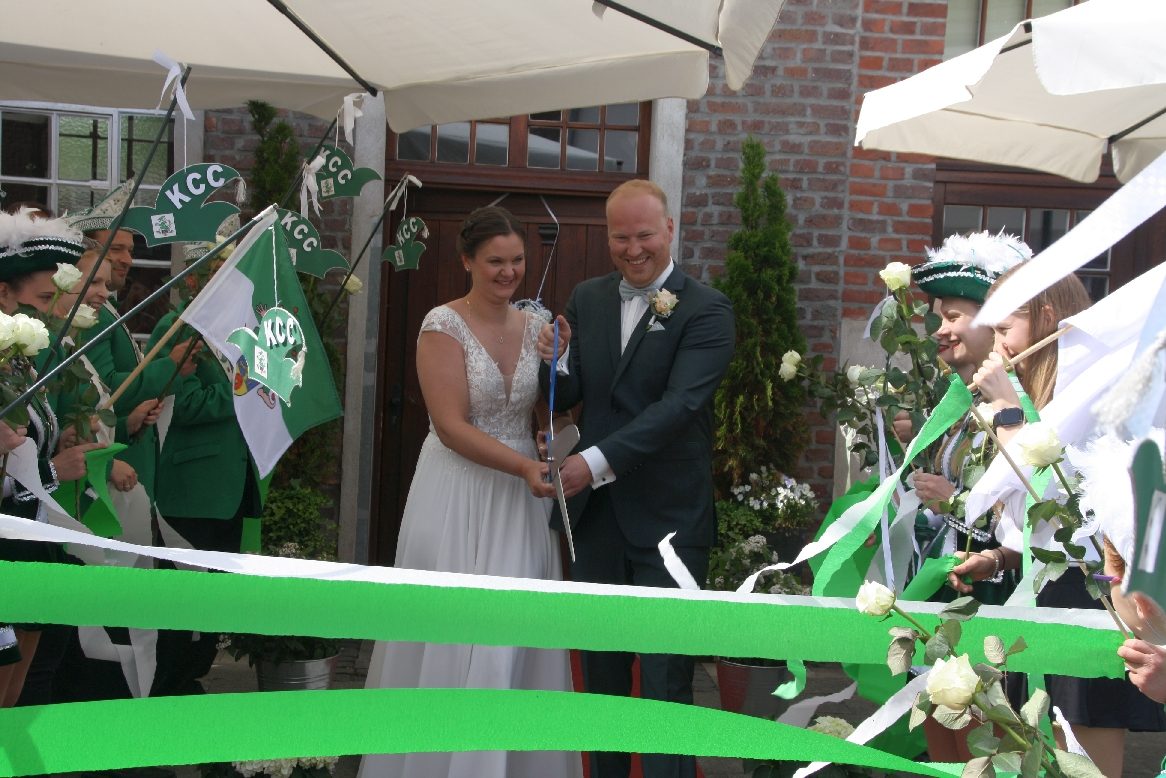 An Bei schönstem Sonnenschein wurde das frisch vermählte Paar an der "Alten Schmiede" in Weeze mit einem wundervollen grün-weißen Spalier durch einige Mitglieder der Tanzsportabteilung, der Gardisten, Gardistinnen und Gardefrauen des Karnevals Club Concordia Goch 1994 e.V. herzlich in Empfang genommen. Als erste gemeinsame Aufgabe, musste sich das Paar mit einer großen Schere den Weg durch grün - weiße Flatterbänder schneiden.